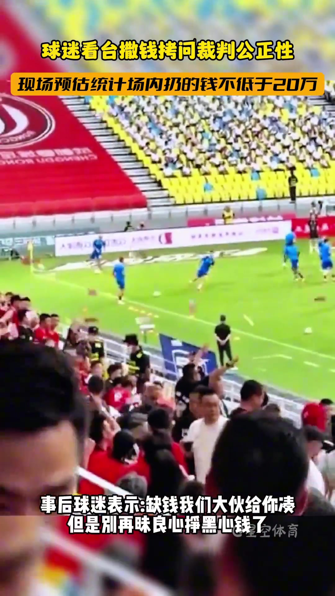 成都蓉城踢武漢三鎮(zhèn)時(shí),看臺(tái)的球迷揮灑大量錢財(cái)拷問裁判